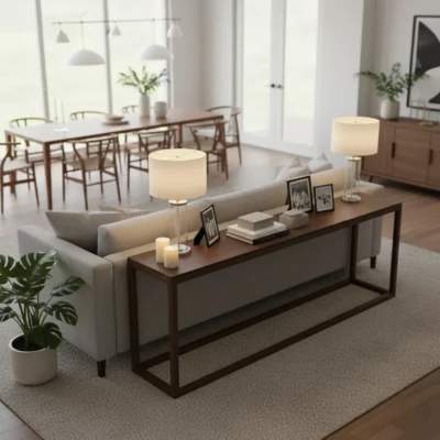 If your living room has an open floor plan, placing a console table behind your sofa is both practical and stylish. It helps define the seating area without closing off the space.