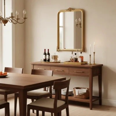 Design tip: Match the finish of your console to your dining table for a cohesive, elegant look. A solid wood console with brass or black handles adds timeless sophistication.