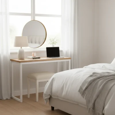 Place one against a wall, pair it with a comfortable chair, and style it with a table lamp and a few inspiring books. It’s a stylish alternative to a bulky desk, perfect for people who want a clean, modern look.