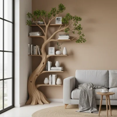 One of the best spots for a tree bookcase is the living room, especially in unused corners that often go to waste. Its vertical design fills the space without making the room feel crowded, making it a smart solution for small layouts.