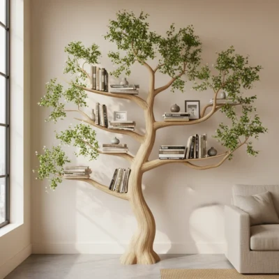A tree bookcase is a type of shelving unit designed to mimic the shape and structure of a tree. Instead of standard horizontal shelves, it features branch-like extensions that hold books or decorative items at varying angles. These vertical, space-saving shelves rise upward like a tree trunk, often spreading out in a balanced, organic pattern — making the piece both functional and visually appealing.