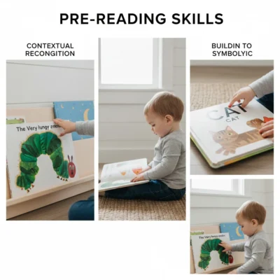 This visual recognition is a precursor to symbolic recognition (reading letters). By seeing the same covers every day in a curated display, the child strengthens their memory and narrative comprehension. They begin to understand that “this image represents this specific world,” which is exactly what happens when they later learn that “this symbol (C-A-T) represents this specific animal.”